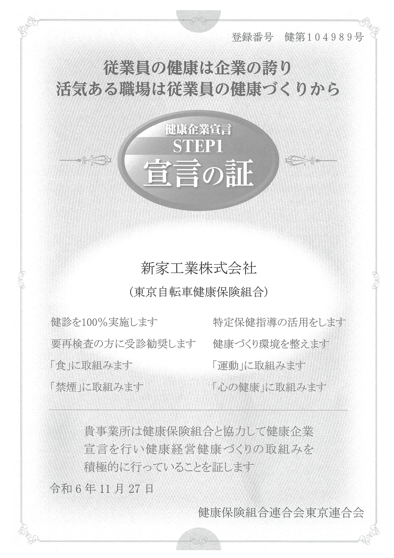 新家工業は、健康保険組合連合会東京連合会に「健康企業宣言」を行い「宣言の証」を取得いたしました。従業員の健康管理と働きやすい職場環境づくりを積極的に進めてまいります。